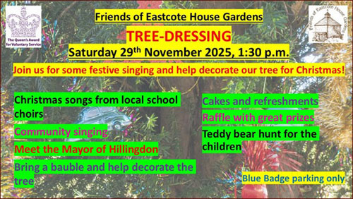 1.30 pm Sat 29th November. Not to be missed a charming ceremony lead by the Mayor of Hillingdon with the support of Friends of Eastcote House Gardens. School choirs and refreshments. Blue Badge parking only